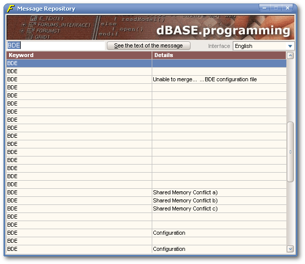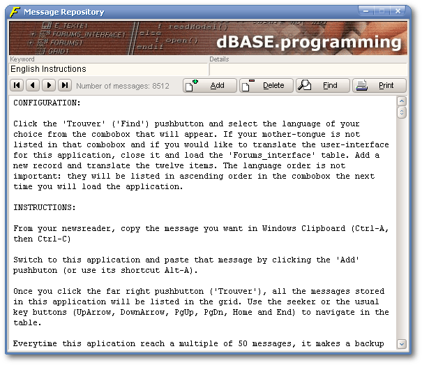 When the 'Find' pushbutton is clicked, the user has access to the second screen of the application (in the example below, many messages have been stored in the application). The entryfield near the top left corner does incremential searches. This means that as soon as the first few letters of a keyword have been entered, the software 'jump' to the first instance of a message whose keyword begins with these letters.