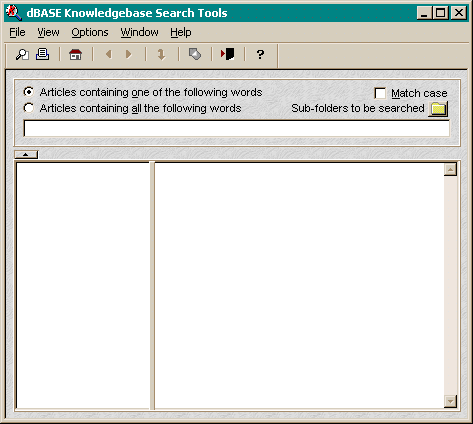 The dBASE Knowledgebase Search Tools are intended to help you search for words or phases contained in the HTML documents that make up the dBASE Knowledgebase. The application runs on your hard drive and it searches a local copy of the Knowledgebase. This application works with dBASE Plus, dB2K, and dBASE SE.
