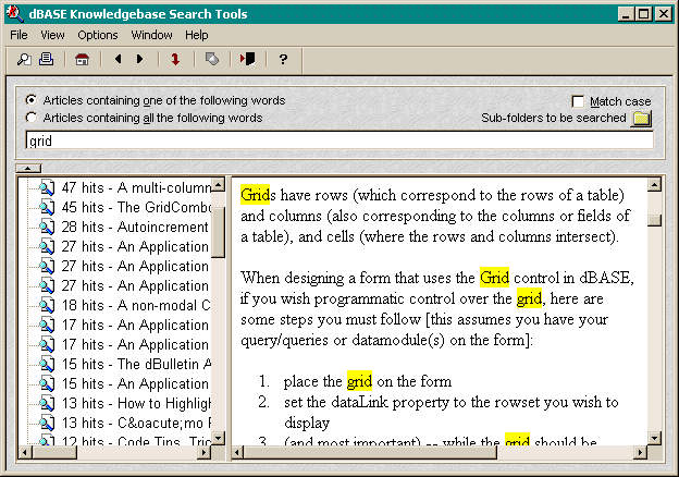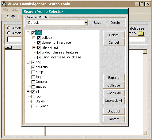 The dBASE Knowledgebase Search Tools can be customized to your immediate needs. You can easily access the root page of each section in the knowledgebase and navigate as if you were using a Web browser. The hit counter can be disabled if needed. And you can choose to search (and save as a profile) any combination of subfolder.