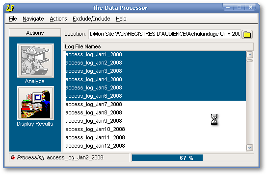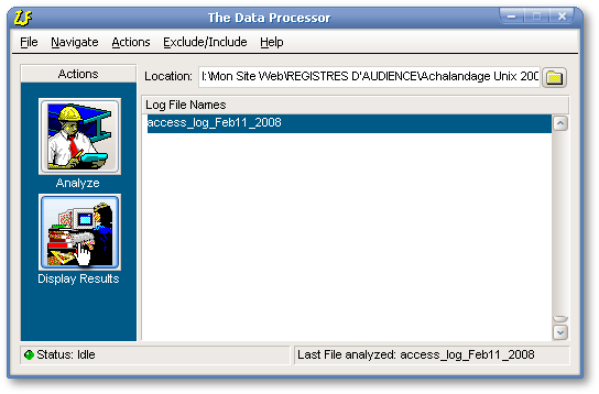 This software is a 32-bit Windows application, compatible with all 32-bit versions of Windows (Win98, WinNT, Win2000 and WinXP). It was not tested under Windows Vista: like thousands of software, its probably not compatible with it. Moreover, it is not a web application in the sense that it has to work locally: you must download your log files and analyze them on your computer. It is composed of two executables: Start_Me.exe and Statistics.exe. The former is the main one. From it, you can select the log files to be analyzed and proceed to the analysis. Once this is done, you can consult the results from that first module or by running Statistics.exe directly.