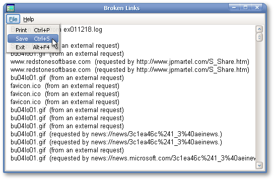 Once the analysis in completed, if some 404 missing page error messages are documented in the log files, a report about the broken links will be displayed (that report can be printed). When the missing page is requested externally (for example, when it was requested through the visitors browser), the name of the missing page will usually be followed by the comment (from an external request). As can be seen below, sometimes the external requests will be identified, but they are the exception, not the rule. On the contrary, when the broken link is caused by some error in the HTML code of a page located on the server, the name of the erroneous page is given. So broken links can be avoided in the future, thanks to this feature.
