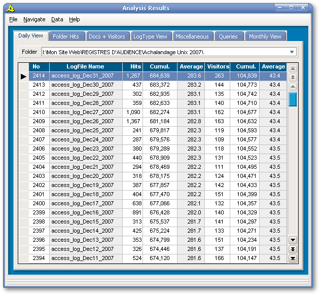 The last tab is one of my favourites. Its a summary of all the data processed by the software. In other words, its a global view. Lets give a look to the first line of the grid, related to the month of December 2007. In that month, there were 15 577 requested for html pages, ZIP or PDF files (because we have limited the analysis to these files only). In that month, there were 1 195 unique visitors. For the whole year, we had 135 627 hits and 13 013 visitors. Since we have log files at our disposal (since April 23rd, 2001), my Web site had to provide 684 639 web pages requested by 104 839 visitors. When the window is maximized or when its horizontal scrollbar is used, average daily hits and visitors, average monthly hits and visitors can be seen. For me, the Monthly View is the best way to see the evolution of a web site.