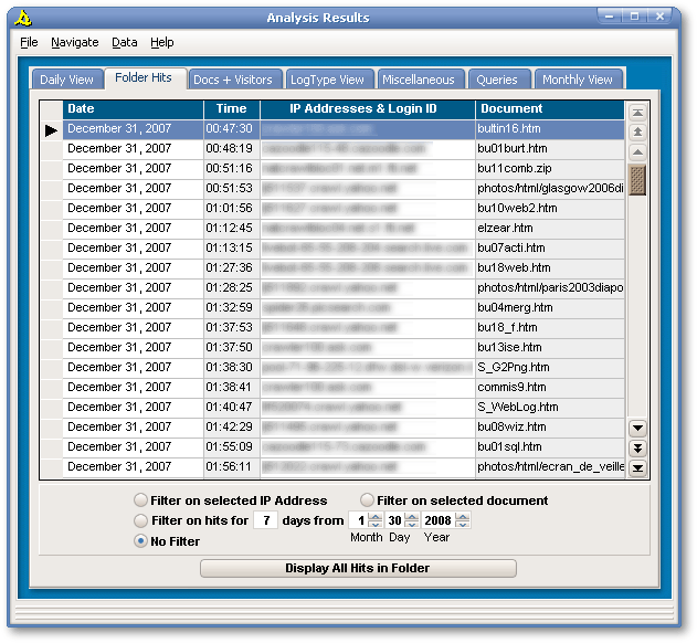 The second tab of the Analysis Results module allows you to see the list of individual hits. By default, these hits are the ones recorded in the log file selected under the Daily View tab. However, if the Display All Hits in Folder pushbutton (at the bottom) is clicked, the hits recorded in all the log files in the current folder will be displayed. The software can also filter on the selected IP Address, on the selected document, or can display all the hits recorded during a certain period of time. If only the hits from a single log file are displayed, filtering on the highlighted document will show only the hits related to that document for that day. On the other hand, if all the hits in the current folder are displayed, that filter will show all the requests for the highlighted document in all the log files processed in that folder.