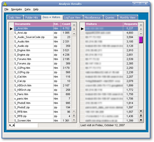 Under the third tab of the Analysis Results module, all requested documents and all the visitors are listed. This is a global view in the sense that these documents and these visitors are those recorded from all the log files processed by this instance of the software. In other words, it is not restricted to the log files in a specific folder, contrary to the first two tabs of the Analysis Results module.
