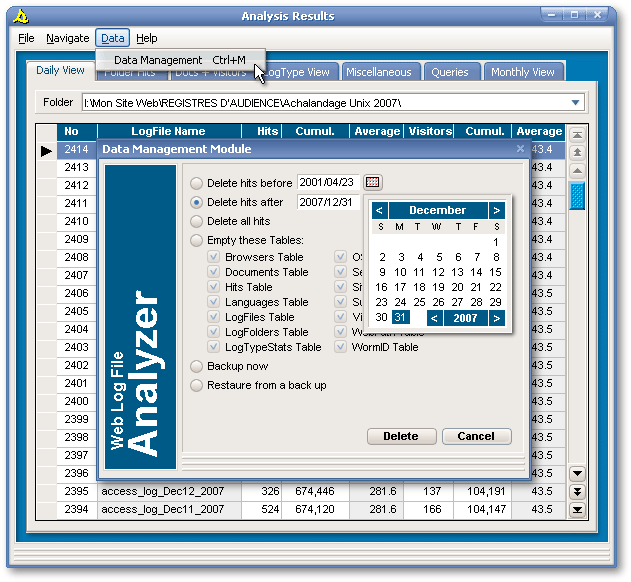 This grid is headed by Power Headers and displays the data related to the log files in the current folder. If you follow my advice to keep the log files for each year in different folders, how come queries can be seen from both 2007 and 2008? Simply because the log file dated December 31st contained a few hits recorded after midnight, January 1st, 2008.