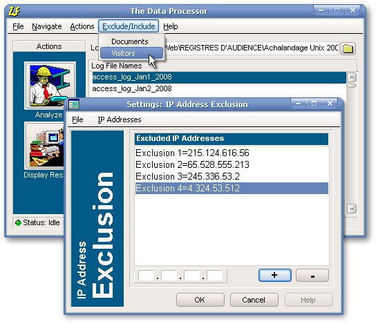 The user can also exclude IP Addresses from the analysis. Many years ago, Ive included a module (illustrated below) whose goal was to avoid counting hits from the users office (such as for testing) or from in-house LAN. These days, in only a minority of the hits, the IP Address is noted (at least in my Apache log files). So this module has little practical usefulness.