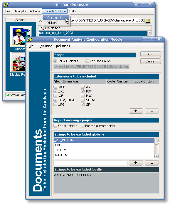 The user can set which file extensions will be processed: unselected file extensions can thus be excluded from the analysis. Missing pages can be recorded as hits or can be excluded from the analysis. In all cases, the Missing Page Report will still be displayed as soon as the analysis is completed. The software will not take into account documents whose names contain a string of characters listed in the exclusion list. Lastly, custom extensions can be set: five extensions can be set globally and five other custom extensions can be set for each folder. That means that Web Log File Analyzer Pro can be used to monitor the access of any kind of document in an Intranet.