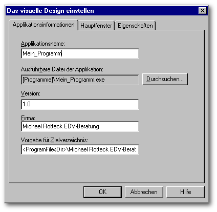 Wenn Sie jetzt einen anderen Applikationsnamen eintragen, der abweicht vom Projektnamen, wird der Projektname als Name für Ihre Applikation in der Programmgruppe verwendet und der Applikationsname für das Verzeichnis.