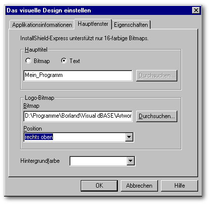 Im Bereich Haupttitel können Sie bestimmen ob der Name Ihrer Applikation als Text oder als eine BMP-Grafik auf dem Eröffnungsbildschirm bei der Installation Ihrer Applikation dargestellt werden soll.