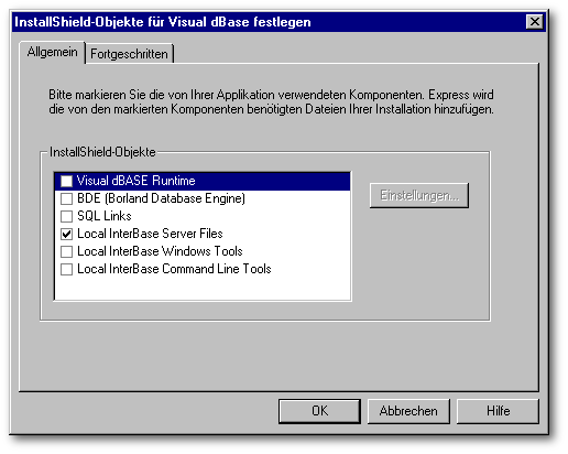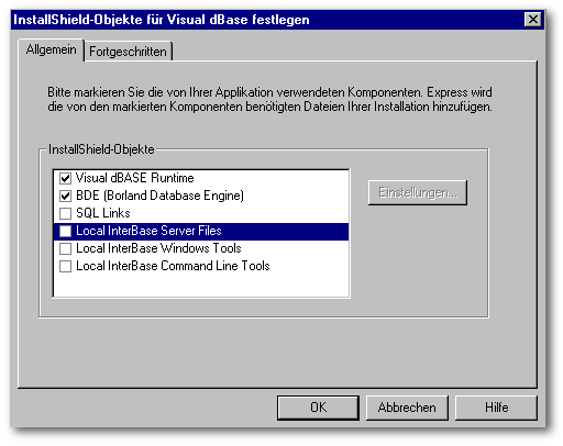 Über den Menüpunkt InstallShield-Objekte für Visual dBASE festlegen können Sie die Installation für Local InterBase auswählen.