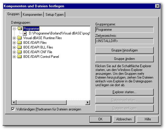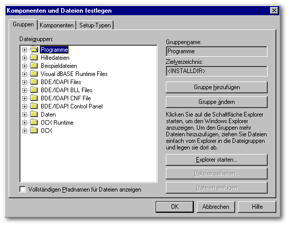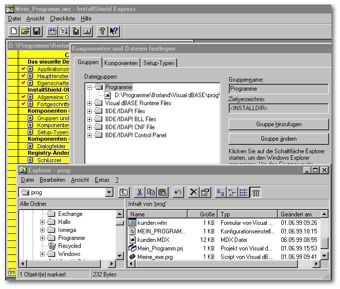 Bisher hat InstallShield Express für uns alles automatisch zusammengestellt. Unter der Gruppe Programme finden wir unsere Applikations-EXE. Er zeigt uns an welche Dateien für die Visual dBASE Runtime Version verwendet werden und welche Dateien für die Installation der BDE.