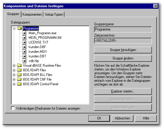 Das Beispiel zeigt die notwendige Aufteilung der Dateien in Gruppen für eine Beispielanwendung auf. Die Erstellung von Gruppen und die Zuweisung der einzelnen Dateien zu diesen Gruppen muß immer unter der Berücksichtigung der Vorgabe für ein benutzerfefiniertes Setup erfolgen. D.h., eine oder mehrere Gruppen müssen zu einer Komponente und diese zu einem Setup-Typ zugewiesen werden können.