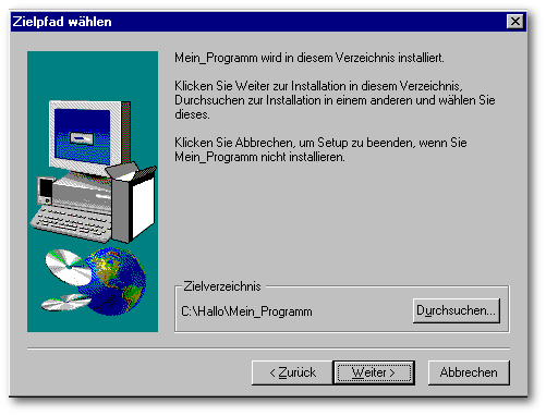 Möchten Sie, daß Ihre Anwendung nicht in den Bereich “Programme” installiert wird, sondern in einem eigenen Verzeichnis, dann verwenden Sie als Verzeichniskennzeichner <WINDISK>.