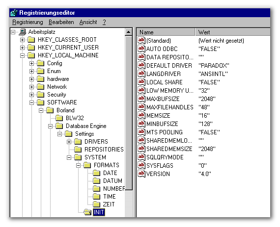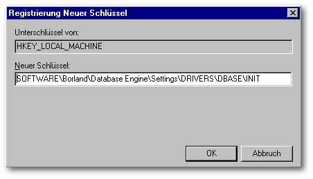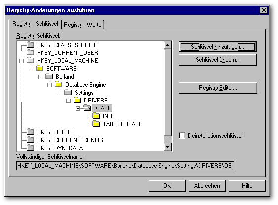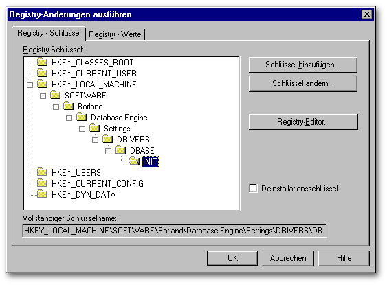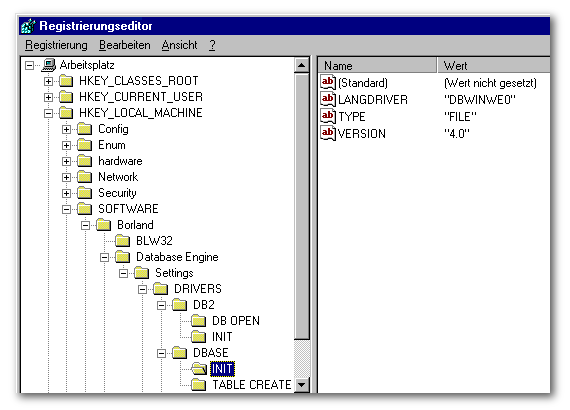 Bei einer Neu-Installation der BDE wird ein Konfigurations-File mit dem Namen IDAPI.CFG erstellt oder ein bereits vorhandener wird aktualisiert. Die Einstellungen für die dBASE-Treiber werden auch in die Registry eingetragen. Änderungen in der Registry wirken sich auch in dem Konfigurations-File aus.
