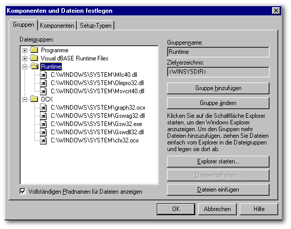 Der Komponente Runtime VdB 7.01 wird die Dateigruppe Visual dBASE Runtime Files zugewiesen.