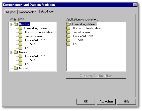 Zum Schluß muß bestimmt werden welche Komponenten zu den Setup-Typen gehören. Dies erfolgt über das Register Setup-Typen.