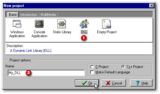 In the New Project dialog box, click the DLL icon, give a name to your project and click the OK pushbutton.