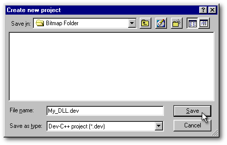 Use the combobox at the top of the Create new project dialog box to move to the folder where your bitmap images are located, then click the Save pushbutton. Dev-C++ will add the .dev extension when it is missing.