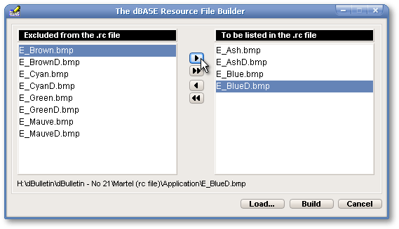 As soon as a folder is selected, the filenames of all the images in that folder become listed in the Excluded from the .rc file listbox, at left. Use the Add or Add All pushbuttons to prepare the list of the filenames to appear in the .rc file.