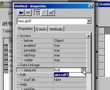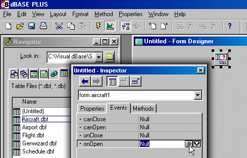 Begin designing a new form. Using the Navigator, switch to the \Samples\Fleet\Tables directory. Click on the Tables tab and drag and drop Aircraft.dbf onto your form. This will create a query object on the form, called Aircraft1.