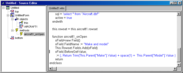oField=new Field() oField.FieldName := "Make and model" This.Rowset.Fields.Add(oField) oField.BeforeGetValue := {; Return Trim(This.Parent["Make"].Value) + space(1) + This.Parent["Model"].Value } |