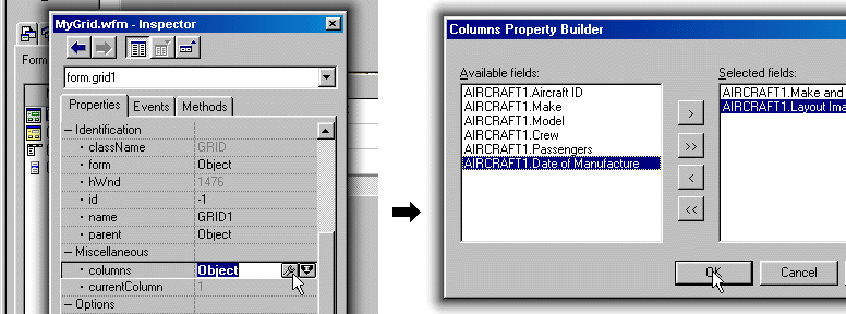 Now, our goal is to get the calculated field onto the grid. To do this you will need to run the query again so that "Make and model" will be available in the Column Selector tool. Unfortunately, if you try to set the query’s active property to false and then back to true, you’ll get an error. But you can effectively run the query again by saving the form (call it MyGrid.WFM) and then open it again with the designer. Once you have done that, click on the grid, bring up the inspector, and click on the tool button of the Columns property. Double-click on the "Make and model" field, and then double-click on the "Layout Image" field. Click on the OK button.