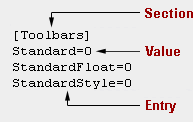 [Toolbars] is referred to in ini-speak as a Section. A Section must be set in square brackets. Standard or StandardFloat or StandardStyle is referred to as an Entry. Each of the zeroes is referred to as a Value. An Entry can have more than one Value, usually comma-separated.