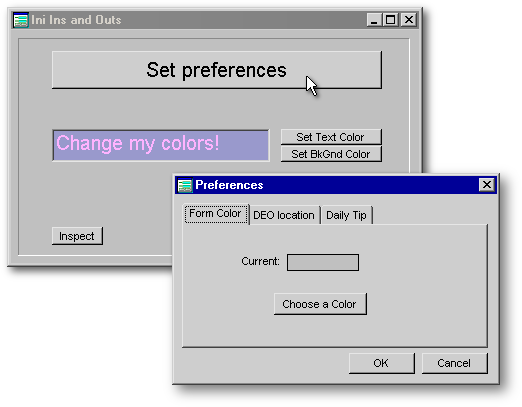 The form called DemoIni.wfm supplied with this article allows several kinds of user preferences to be stored in the INI file and then retrieved. Below is a screen shot of the main form and its modal sub-form opened by the Set Preferences button: