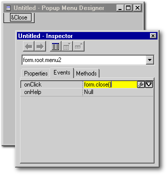 Then, as you would for a normal menu, open the Inspector if it isn’t open yet, and under its Events tab, in the slot for the onClick() event for this new menu item, get rid of the default null and type form.close() instead as shown in the Inspector slot below.