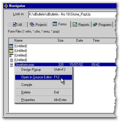 Before we attach this menu to a form, let’s take a look at the code dBASE generated to define this popup menu. To do this, right-click the Closeform.pop item in the Navigator as shown below…