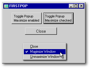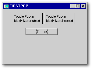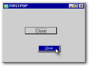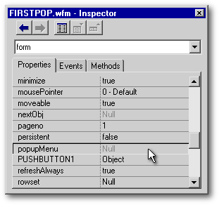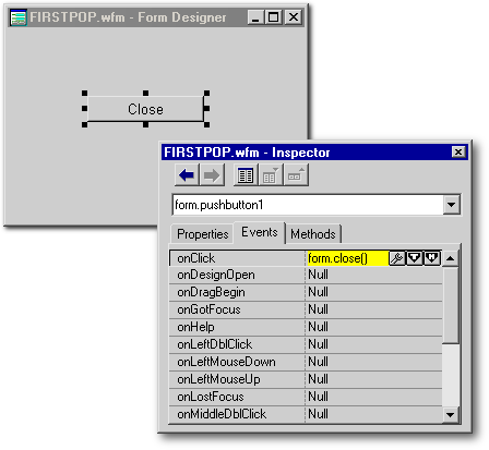 No matter how we attach a popup menu to a form, we need a form in order to do it since popups only happen in the context of a form. So, create a form called FIRSTPOP.WFM, and drop a pushbutton on it (we need SOMEthing on this very simple form), set its text property to Close, and use the Inspector to set its onClick() event to close the form just as you did for the popup menu: