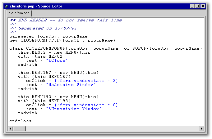 3. the class constructor code. In this case, since there is only one menu item (the one to close the form), there is only a single menu item which dBASE has arbitrarily named MENU2, instantiated from the MENU class to attach to the popup.
