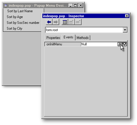 In the same way, the onClick() code of an item in a popup menu can call any built-in method or programmer-written function of the form, just as the code in a pull-down menu can: