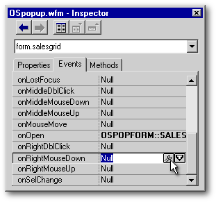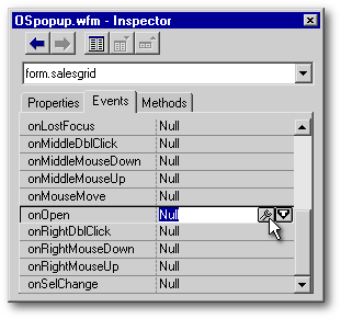 2. Click the Events tab in the Inspector, then find the form’s onOpen() event, and click it’s wrench-thing so that you can create some popup-related code for this event.