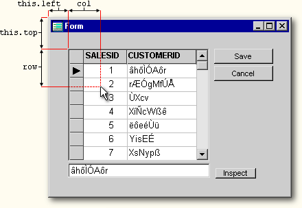 This approach also solves the previous problem of having to make adjustments for multiple left and top offsets, so if you use it, you won't need to use Jamie’s doPopup() procedure. Below is an example of a form that shows both positioning problems being solved at once — the popup is located several “offsets” deep and is within three thick container borders and a grid border, yet it is precisely aligned with the tip of the mouse pointer: