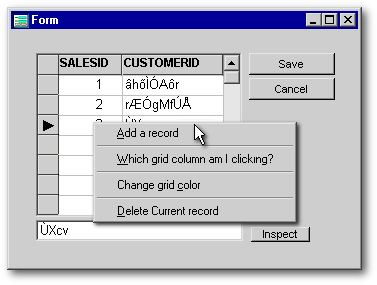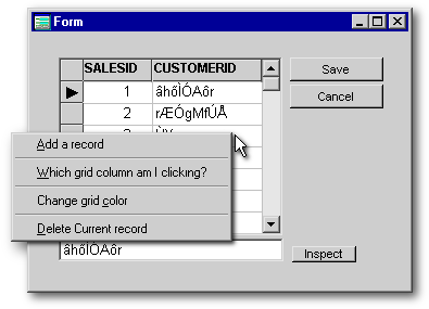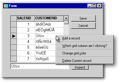 This is a bit trickier to accomplish than it may seem at first glance. The problem is this: the standard form-based popup instantiated into form.popupMenu will be invoked anywhere on the form, even over objects such as grids and listboxes with their own popups. Furthermore, dBASE is constructed such that the form’s popup “event” takes precedence over the onRightMouseDown() event of any object on the form. This leads to some bizarre behavior: right-click the grid and get the form’s popup; then, after releasing it, the grid’s popup appears. Obviously, this is not what we want.
