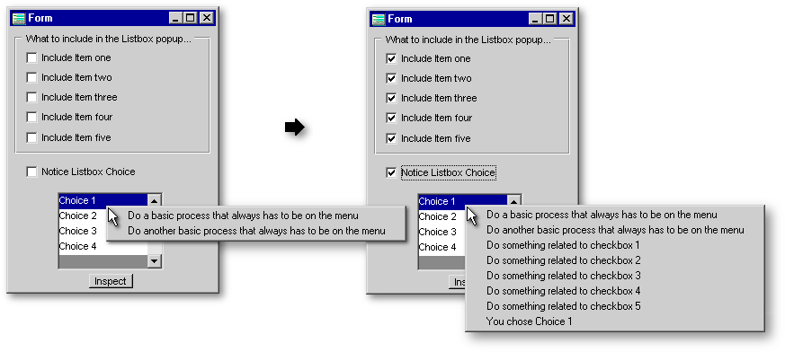 Below are two shots of the form and popup menu: at left, when none of the checkboxes are checked; and at right, when all of the checkboxes are checked.