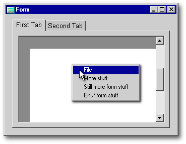 A while back, Gary White provided a nice example of how to get around this problem, and it is very simple. The solution is to not use the built-in form.popupMenu property. Instead, instantiate the form’s popup into a custom form property with a different name (anything other than form.popupMenu will do), and then write the usual few lines of code to position and open it in the form’s onRightMouseDown() event. This event respects the onRightMouseDown() of objects on the form and so doesn’t fire when the mouse is right-clicked over form objects.