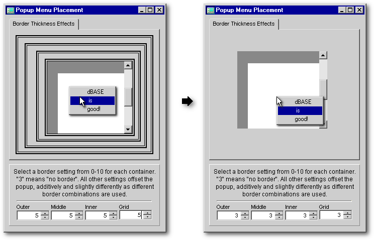 The difference in placement of the popup menu is evident: when the menu pops up within 4 double-thick borders, even Jamie’s procedure cannot overcome the menu’s substantial offset from its proper position; but when there are no borders present, the placement becomes perfect. You may never use three nested containers with a grid and its popup menu located in the deepest level, but you will run into this issue to some degree with any number of nested objects if they have borders. Then again, you may not care about this relatively minor problem! Your users would probably not even notice it.