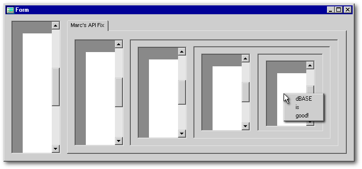In the screenshot above, you may have noticed that the tip of the mouse pointer is still slightly displaced to the right and down from the upper left corner of the menu. Why has this occurred? There are no flaws in Jamie’s code. It is instead related to a minor glitch (or perhaps a purposeful omission) in dBASE — a failure to account for the thickness of the border of objects such as containers, grids, and listboxes when reporting theirleftand top values. A couple of additional examples are shown below to illustrate the extremes.