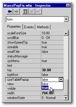 Setting the form’s popupMenu property to false keeps UseTablePopup from being over-ridden. When you want to bring back the form’s regular popup, reset the property using the popup’s name. In the above form, the popup’s name was set (during instantiation) to FirstPOPUP, so it is referred to here as form.FirstPOPUP. [Remember that a form-based popup has its object reference stored in two places: in form.popupmenu, and in form.popupName where popupName is the name given to the popup during instantiation]. What you are doing here is temporarily obliterating the popup’s object reference in form.popupmenu. |