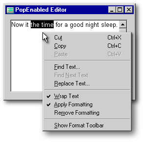Instead, popups resemble just the pulled-down portion of a single pulldown menu. Actually, Windows considers any menu other than the MENUBAR to be a “popup”, but here I am differentiating between “pulldown” (beneath a menubar) and “popup” (shortcut or context) menus. Any popup menu, whether pulldown or shortcut, can employ sub-menus that branch off of the main choices.